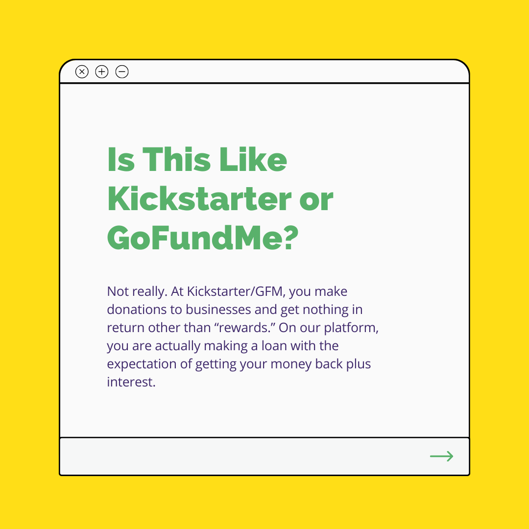 We decided to partner with Honeycomb because they’re a platform that allows small businesses like us to raise money from our community instead of a bank. However, we’re not asking for donations like a Kickstarter or a GoFundMe - you actually get to invest in us, and we can pay you back, with interest!