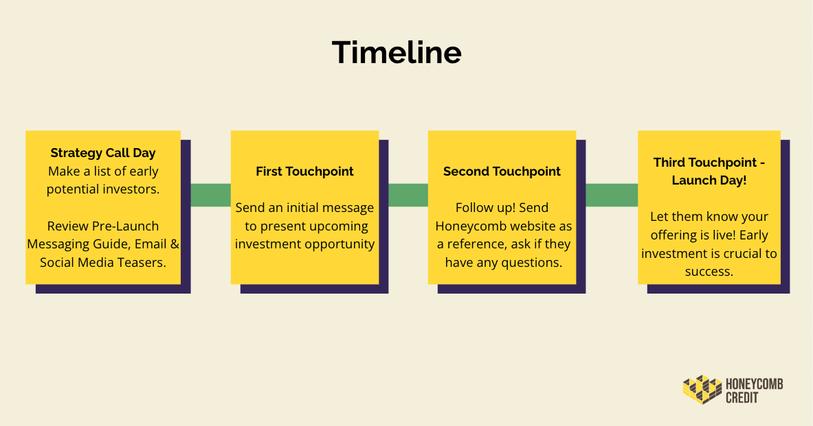 Follow this timeline to let your personal network know about your upcoming offering. Remember, strong follow-up is key!